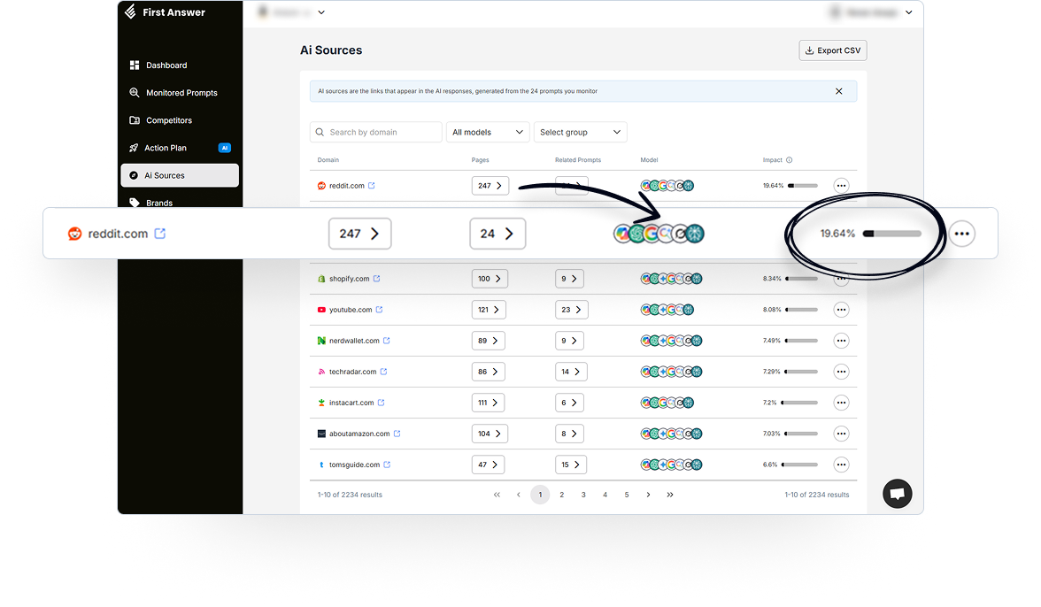 First Answer lets you track how your brand appears in responses from the leading AI platforms such as ChatGPT, Google AI Overviews, Copilot, and others.