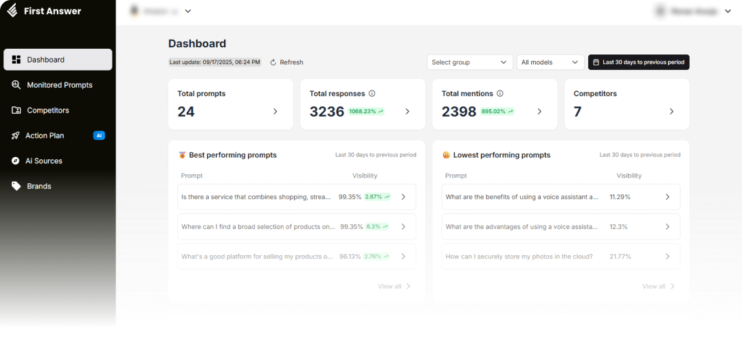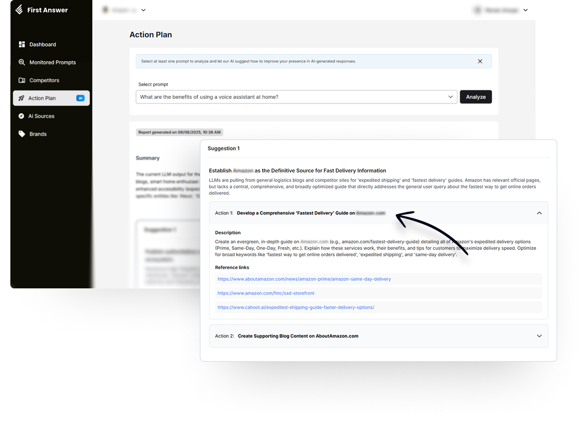 With First Answer, you connect prompts to AI search keywords, apply GEO strategies, and access complete insights.